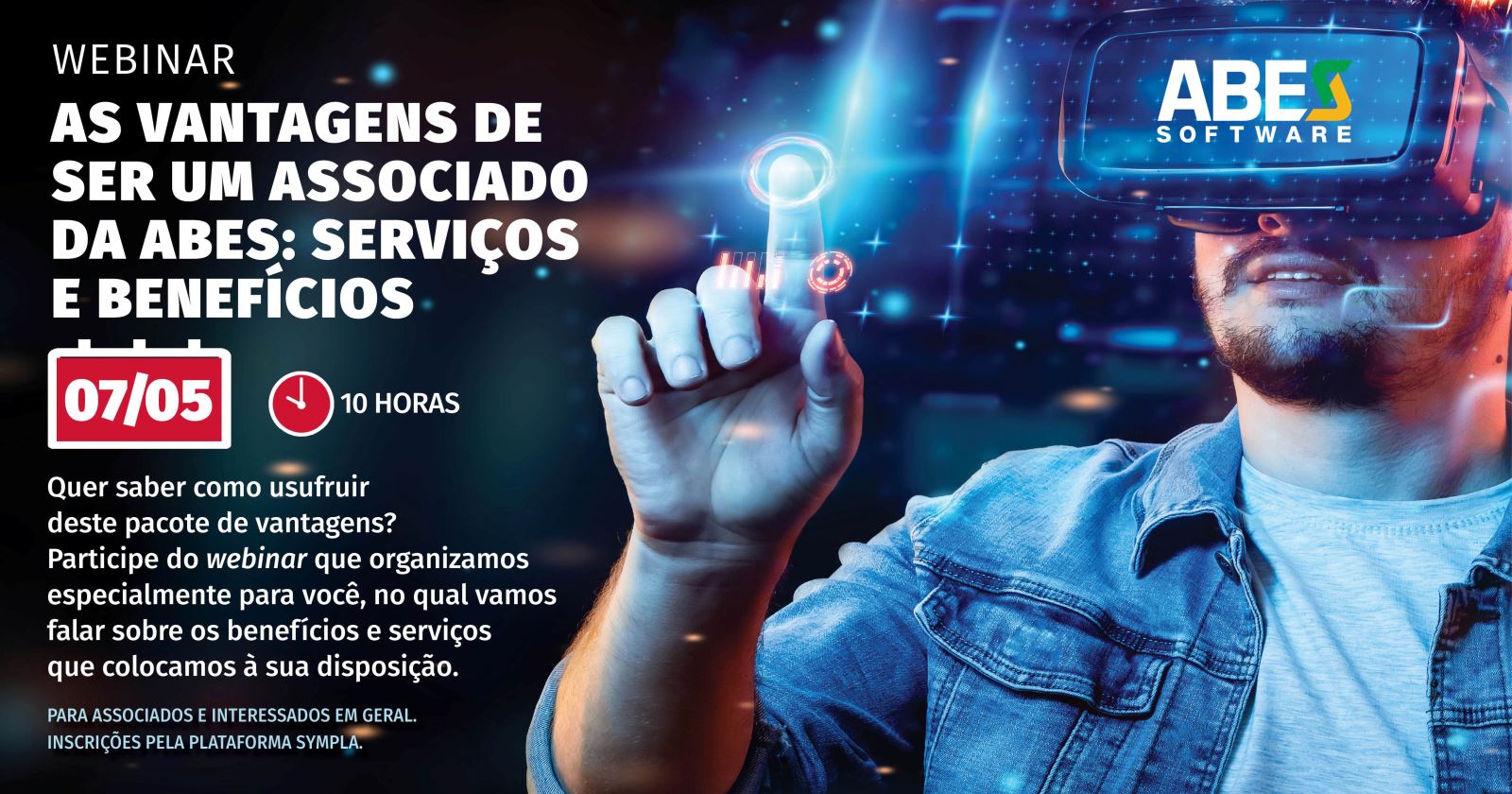 E, para apresentar este pacote de vantagens? A ABES organizará um webinar, no dia 07 de maio, às 10 horas, no qual representantes da associação vão falar sobre os benefícios e serviços que são colocados à disposição dos associados. Este webinar é direcionado a representantes de empresas que já são associadas e querem conhecer mais a entidade, às startups e empresas de diferentes segmentos, que possam ter interesse em se associar à entidade.