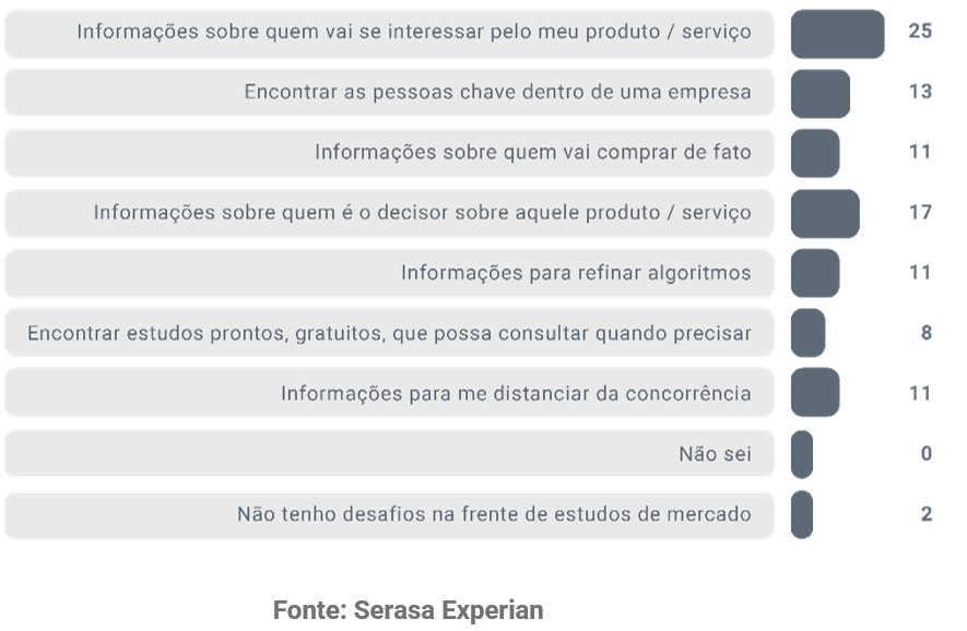 1. Estudos de mercado: um quarto das empresas respondentes (25%) apontou a identificação de potenciais interessados em seus produtos ou serviços como maior obstáculo e, em segundo lugar, 17% consideraram desafiador determinar quem são os decisores sobre a compra. Veja todo o levantamento desta visão no gráfico a seguir: