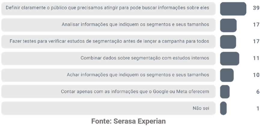 2. Segmentação: 39% das empresas apontaram como principal adversidade a definição clara do público-alvo necessário para buscar informações pertinentes. Em relação ao desafio menos latente nesta visão, 11% relataram o desafio de integrar dados de segmentação com estudos internos, visando aprimorar suas estratégias de marketing. No gráfico abaixo, veja outras constatações: