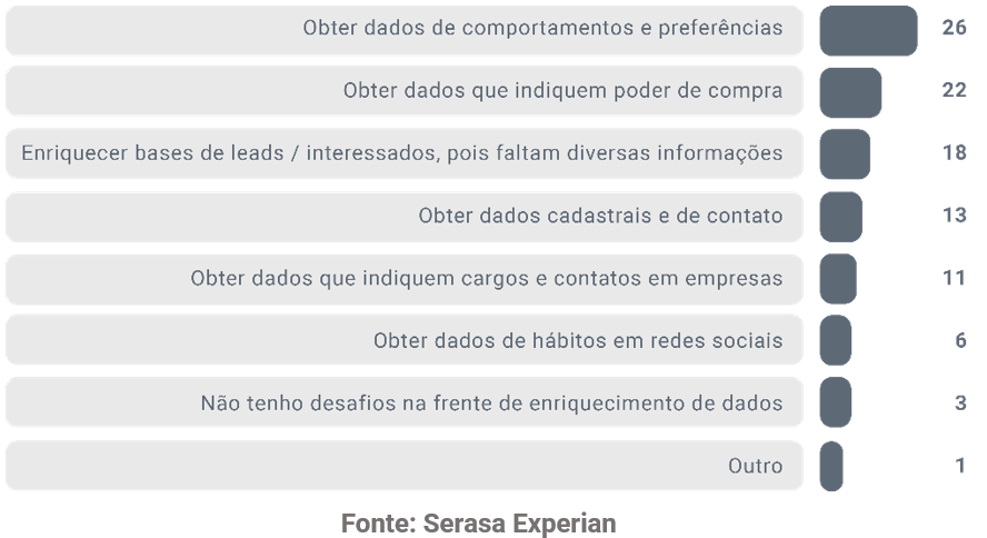3. Enriquecimento de dados: a obtenção de dados de comportamentos e preferências foi apontado por 26% das respondentes como a maior dificuldade. Já 22% disseram que seria a obtenção dos dados que indiquem o poder de compra dos consumidores. Confira a seguir todos os desafios apontados: