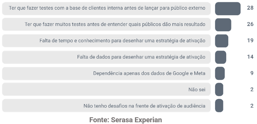 4. Ativação de audiências: 28% das empresas consideraram o “teste com a base de clientes interna antes do lançamento ao público externo” como o maior desafio nessa frente. “A necessidade de realizar múltiplos testes para identificar quais públicos geram melhores resultados” veio em seguida, com 26% das escolhas. Veja o ranking completo desta visão no gráfico a seguir: