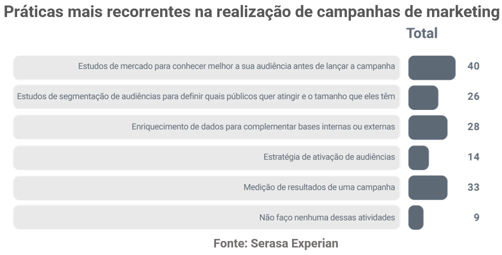 São diversas etapas envolvidas antes, durante e depois das campanhas de marketing. Conforme revelado pelo estudo, a atividade que mais recebe atenção das empresas (40%) é a realização de “estudos de mercado para conhecer melhor a sua audiência antes de lançar a campanha”. Já durante a execução, o foco principal recai sobre a “medição de resultados” (33%), seguida pelo “enriquecimento de dados para complementar bases internas ou externas” (28%). Confira o ranking das práticas mais recorrentes na realização de campanhas de marketing: