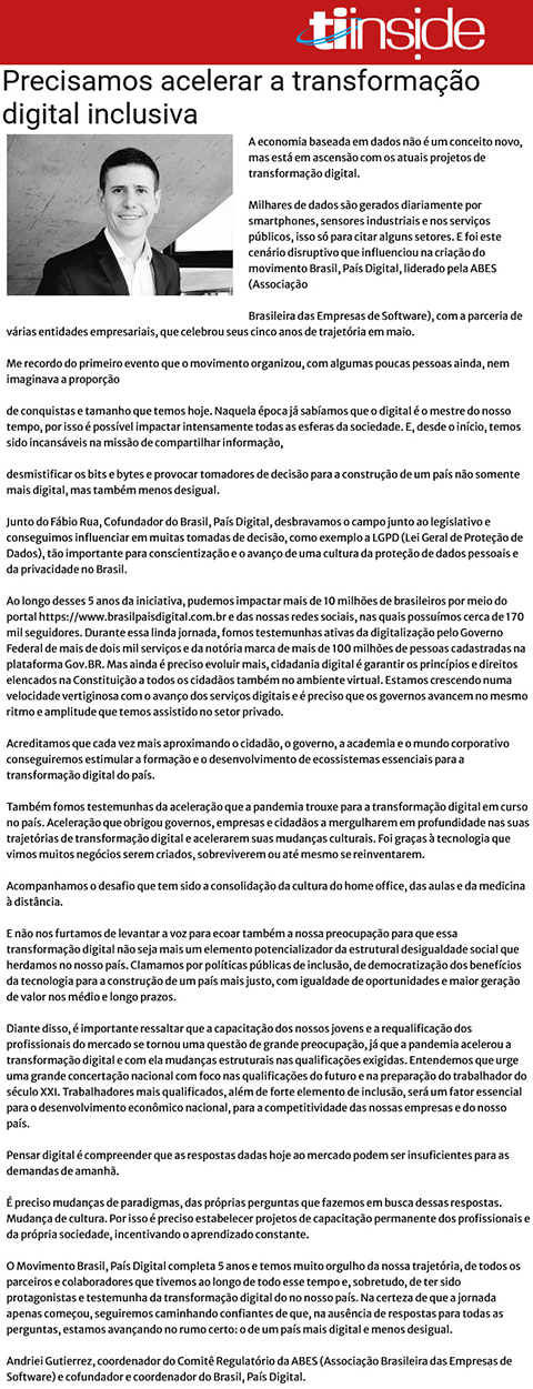 O Brasil, País Digital é um movimento liderado pela Associação Brasileira das Empresas de Software (ABES) criado em 2016, que tem o apoio de várias organizações da sociedade. O objetivo do movimento é trabalhar pela construção de um Projeto de Nação que seja mais digital e menos desigual, compartilhando informações e promovendo o debate sobre transformação digital inclusiva.