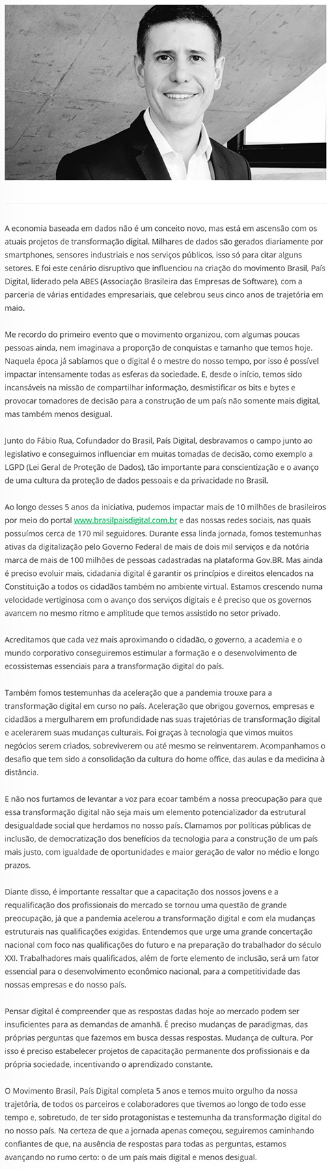 O Brasil, País Digital é um movimento liderado pela Associação Brasileira das Empresas de Software (ABES) criado em 2016, que tem o apoio de várias organizações da sociedade. O objetivo do movimento é trabalhar pela construção de um Projeto de Nação que seja mais digital e menos desigual, compartilhando informações e promovendo o debate sobre transformação digital inclusiva.