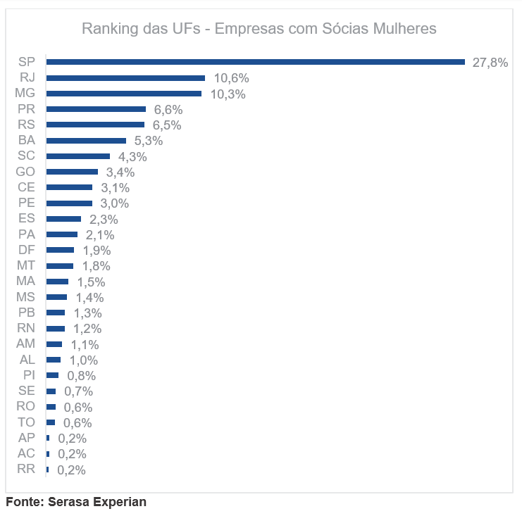 The region that most concentrates businesses whose main partners are women is the Southeast (51.1%), followed by the Northeast (17.9%), South (17.4%), Midwest (9.1%) and North (4.4% ). In the analysis of the Federative Units (UFs) it is in São Paulo (27.8%) that most of the female enterprises are located, then comes Rio de Janeiro (10.6%), Minas Gerais (10.3%) and Paraná (6.6% ). See the chart below for the full ranking: