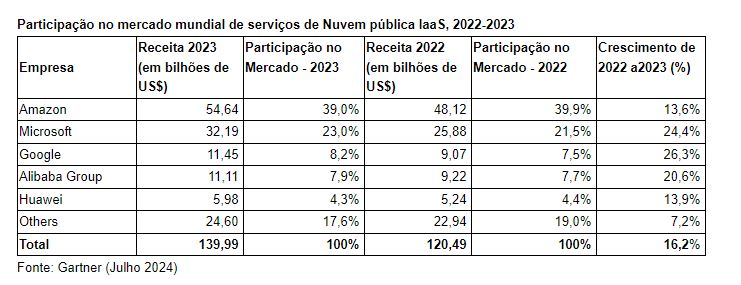 The global Infrastructure as a Service (IaaS) market grew by 16.2% in 2023, totaling US$140 billion, compared to US$120 billion in 2022, according to a forecast by Gartner Inc. Amazon maintained the No. 1 position in the Infrastructure as a Service market in 2023, followed by Microsoft, Google, Alibaba, and Huawei.