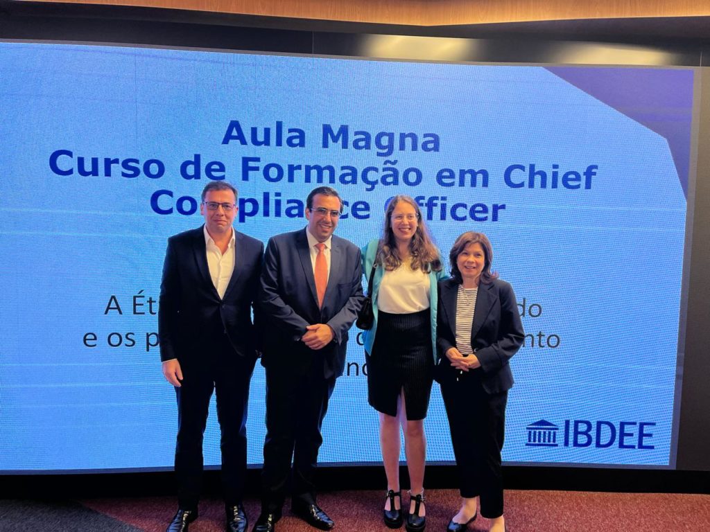 As the first action resulting from the partnership, Clara Savelli, Project Coordinator at ABES, was present at the inaugural class of the Chief Compliance Officer Training course, an IBDEE initiative, which took place on Monday (26/02). The coordinator was received by Godofredo de Souza Dantas Neto, president of the institute, and professors Guilherme Corona R. Lima and Adriana Esper.