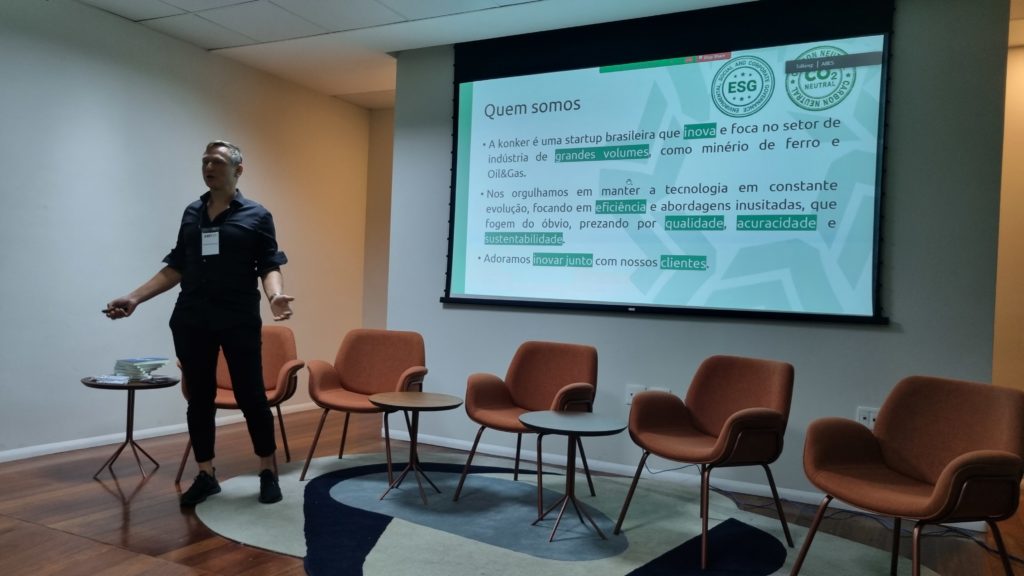 Richard Feund, CEO of associated Konker. Mining, was the first company to present itself. She's a Brazilian startup that focuses on an innovative technology based on cosmic ray telescopes for measuring iron ores, which are installed at the base of batteries. The technology meets the needs of ore production, providing real-time information about the grade and size of the pile, and can also be applied to ensure the safety of ore dams in order to reduce the risk of environmental disasters.