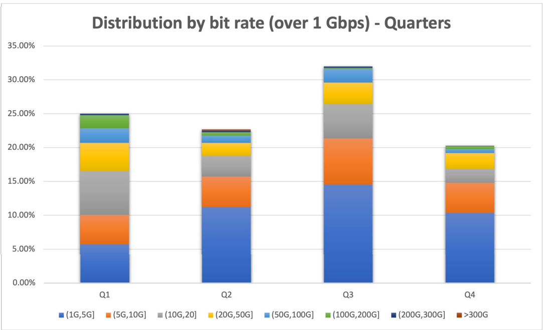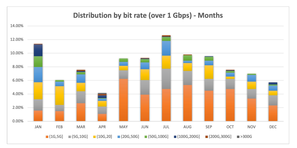 3. In the chart below, NSFOCUS has identified attack sizes larger than 1Gbps distributed month by month and how much each size represents within a given month.