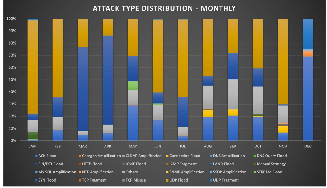 5. When analyzing the types of attack, month-to-month, the company noted that the UDP Flood was still prevalent and was highlighted in January 2022. The ACK Flood took second place.