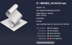 Xu Yiqing's Resume_20230320.app was submitted to VirusTotal on April 5th. This applet uses a compiled run-only AppleScript to trigger a remote C2 server and download a Geacon payload.