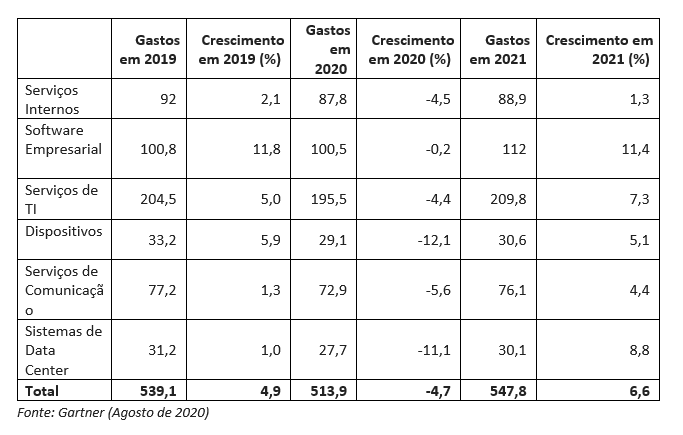 Gartner, Inc., the world leader in corporate research and advice, warns that worldwide IT spending in the banking and securities brokerage sectors is expected to fall by almost 4.7% in 2020, bringing in US$ 514 billion worldwide. The investments in PCs and mobile devices will have the biggest drop (reduction of 12.1%), followed by systems for Data Centers.