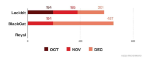 Number of LockBit, BlackCat, and Royal ransomware file detections, on machines, by month, in Q4 2022. Source: Trend Micro™ Smart Protection Network™.