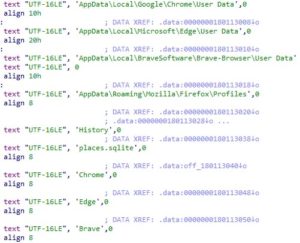 The final stage (cad1120d91b812acafef7175f949dd1b09c6c21a) implements the infostealer functionality, including collecting information from the system and from Chrome, Edge, Brave and Firefox browsers. This includes querying browsing history and local data on Firefox-based browsers and history for Chrome-based browsers.