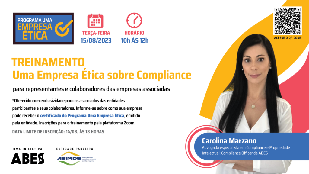 The next TRAINING AN ETHICAL COMPANY ABOUT COMPLIANCE will take place on August 15, 2023, from 10 am to 12 pm. The activity will address good practices in the fight against corruption, in the relationship with suppliers and members of public management, the appreciation of integrity and governance, fair competition and a healthy environment in companies. Entries must be made by 14/08 at 18:00.