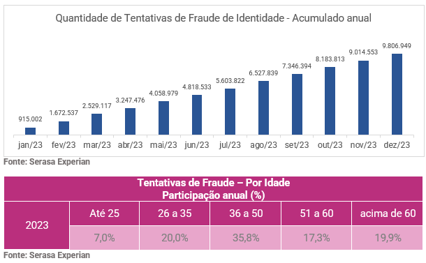 The year 2023 recorded a total of 9,806,949 identity fraud attempts, which were unsuccessful thanks to Serasa Experian's authentication and scam prevention tools. Consumers aged 36 to 50 were the main targets of criminals in the period (35.8%). See the complete data in the graph and table below: