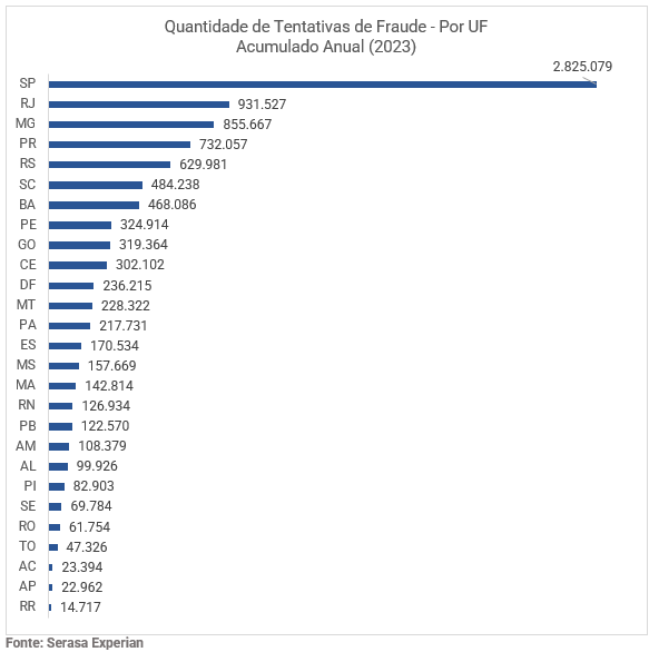 The indicator data also shows that the states in the South and Southeast regions were the most targeted by criminals to commit identity fraud. See, in the graph below, the volume of inquiries by Federative Unit (UF):