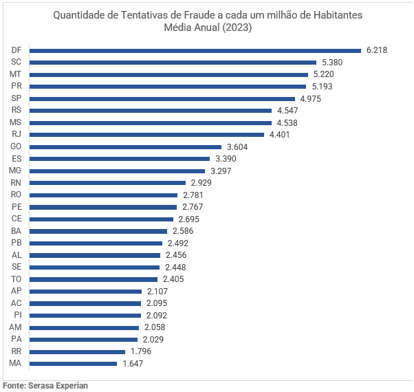 The annual average was 3,780 fraud attempts per one million inhabitants in 2023, with the Federal District leading the ranking with 6,218. Check out the complete list in the chart below: