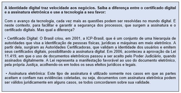 “The exchange of information becomes more agile and much more secure with the digital certificate. A physical document requires great care in handling and sending it to the parties involved, as the paper opens up loopholes for fraud and misuse of information. Many companies already use the digital certificate to fulfill their fiscal commitments, but they are not aware that it is also possible to sign documents in an electronic environment with the same certificate”, says Balassiano.