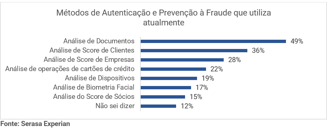 To prevent fraud, the research also revealed that companies consider the layers essential, the main ones being “Document Analysis” (49%), “Customer Score Analysis” (36%), “Company Score Analysis” (28%), “Analysis of credit card operations” (22%) and “Device Analysis” (19%). Check out the complete ranking: