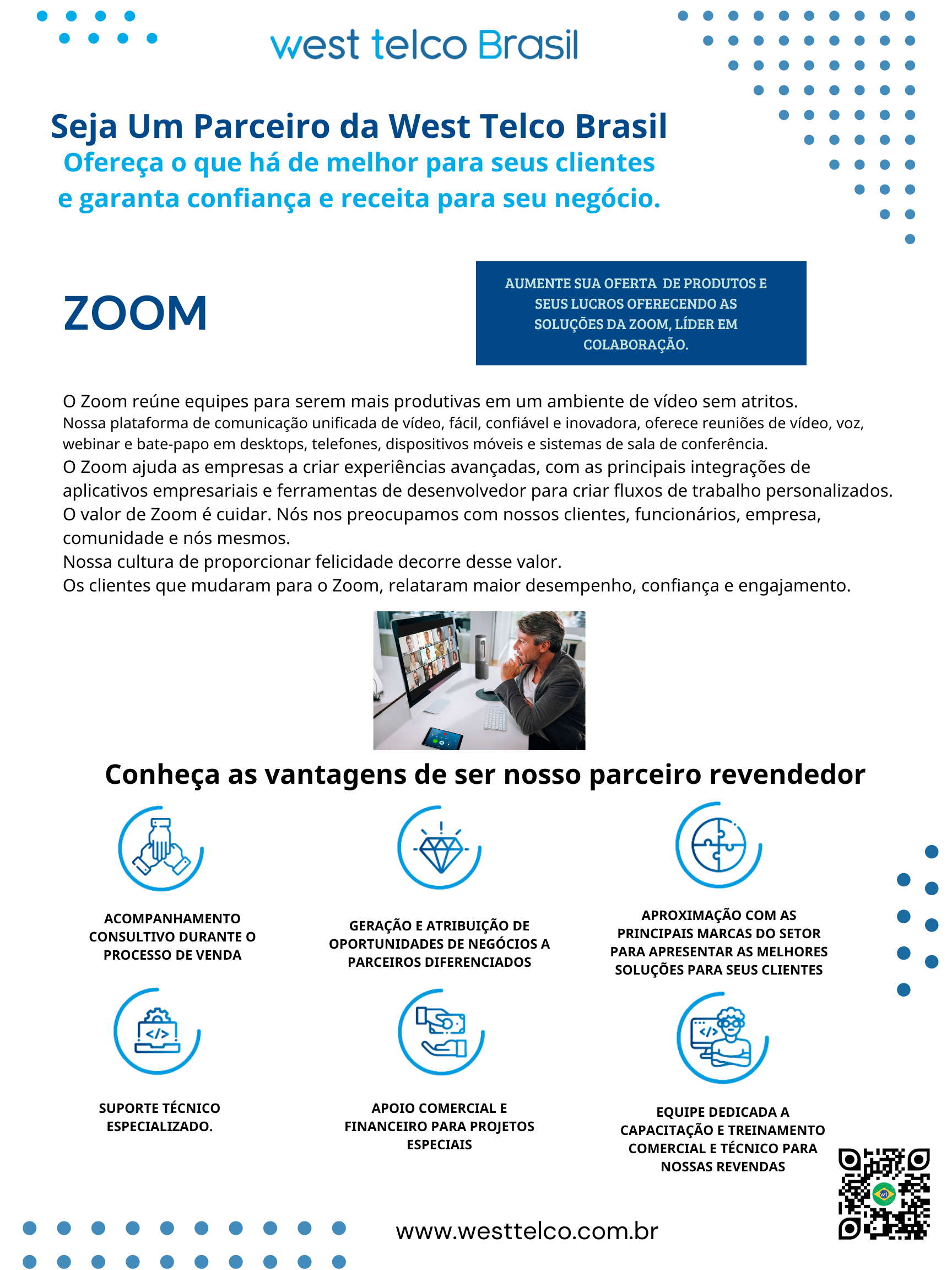 West Telco Brazil, a reference company in the distribution of technological solutions, is looking for commercial partners in the national market, who are interested in incorporating Zoom into their portfolio of commercialized solutions.