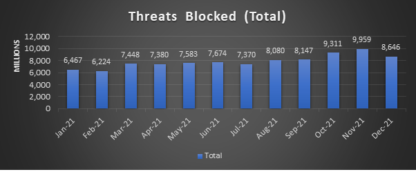 Embora as ameaças totais bloqueadas tenham apresentado uma redução de 13,2% em dezembro, elas registraram aumento no quarto trimestre, especialmente em novembro, fechando o ano com 94,2 bilhões* de tentativas de ataques cibernéticos, um aumento de 42% em relação a 2020.