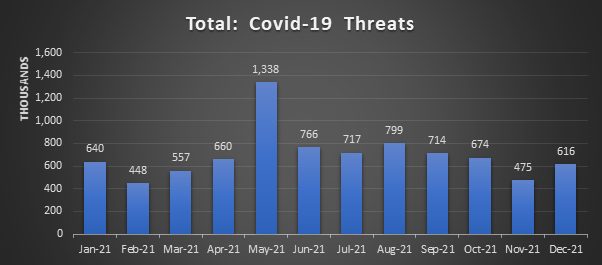 A maioria das ameaças que usam o tema da Covid-19 é realizada por e-mails. Foi observada uma queda significativa de maio a junho, mas em agosto voltou a subir. Em dezembro, a ameaça ainda se mantinha ativa, com mais de 600 mil registros.