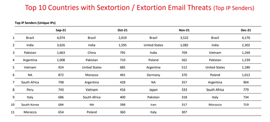 A Trend Micro, uma das principais empresas em soluções de cibersegurança, acaba de divulgar o relatório Fast Facts com análise do cenário mundial das ameaças digitais de janeiro a dezembro de 2021. O relatório mostra que o Brasil é o país que mais envia ameaças de extorsão e sextorsão (do termo em inglês sextorsion), que é a chantagem sexual. Já os Estados Unidos são o principal alvo de extorsões. O estudo tem como base endereços de IP únicos.