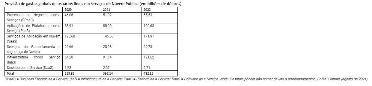 Como resultado, a adoção global da Nuvem continuará a se expandir rapidamente. O Gartner prevê que os gastos globais de usuários finais com serviços de Nuvem Pública chegarão a US$ 396 bilhões em 2021, e crescerá mais 21,7% para chegar a US$ 482 bilhões em 2022. Até 2026, o Gartner prevê que os gastos com Nuvem Pública excederão em cerca de 45% todos os gastos corporativos de TI, contra menos de 17% em 2021.