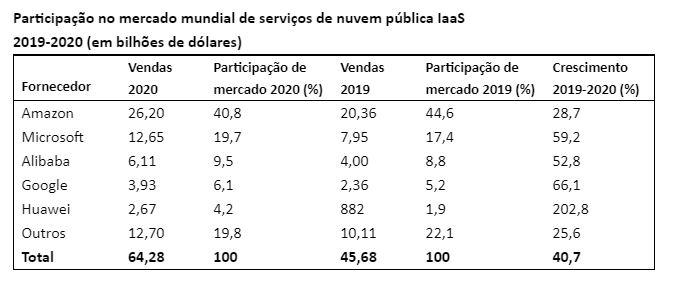 Em 2020, os cinco principais fornecedores de IaaS responderam por 80% do mercado e praticamente todas essas empresas (90%) apresentaram crescimento. A Amazon continua na liderança do mercado mundial de IaaS com US$ 26,2 bilhões de receita acumulada em 2020m=, que corresponde a 41% de participação de mercado. O crescimento de 28,7% da empresa foi ligeiramente mais lento do que o da indústria em geral, com o crescimento das vendas refletindo principalmente o aumento do uso dos clientes.