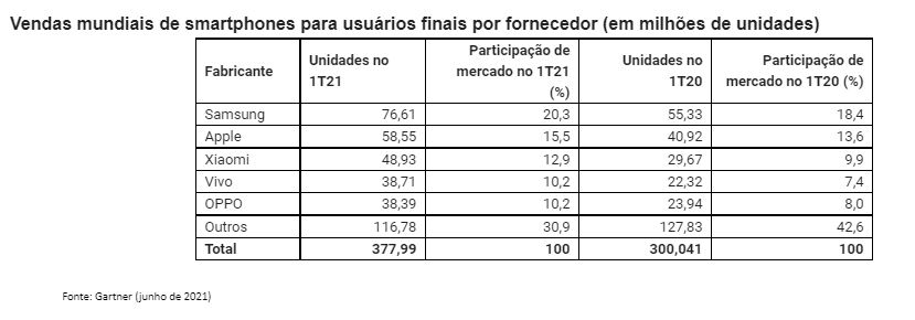 Todos os cinco principais fornecedores globais de smartphones registraram forte crescimento na comparação com 2020, indicando que o mercado de telefonia está se consolidando em torno dos cinco principais fornecedores. Os fabricantes chineses Xiaomi, Oppo e Vivo testemunharam a crescente demanda por smartphones 5G e capitalizaram as oportunidades devido ao enfraquecimento das vendas da Huawei e LG globalmente neste trimestre.