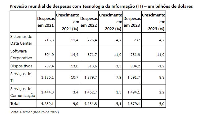 De acordo com a mais recente pesquisa do Gartner, Inc., líder mundial em pesquisa e aconselhamento para empresas, os gastos mundiais com TI devem totalizar US$ 4,5 trilhões em 2022, um aumento de 5,1% em relação a 2021.