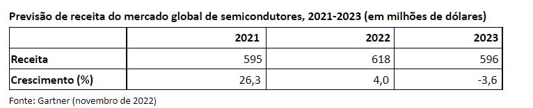 O Gartner, líder mundial em pesquisa e aconselhamento para empresas, anuncia nova pesquisa que mostra que a receita global do mercado de semicondutores deverá cair 3,6% em 2023. A tendência vai na contramão do que era esperado para este ano. De acordo com a pesquisa do Gartner, a receita global de semicondutores está prevista para totalizar US$ 596 bilhões em 2023, abaixo da previsão anterior que era de US$ 623 bilhões.