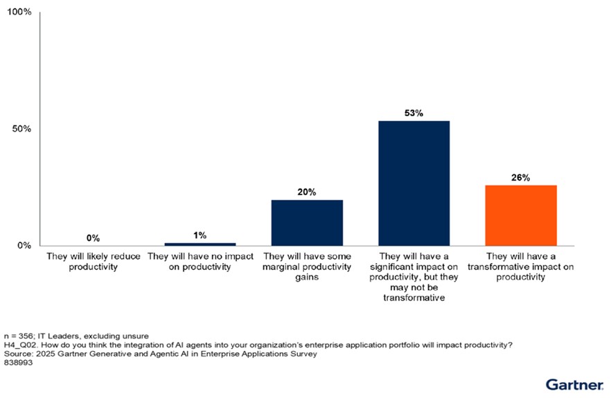 Em maio e junho de 2025, o Gartner conduziu uma pesquisa em todo o setor com 360 líderes de aplicações de TI de organizações com pelo menos 250 funcionários em tempo integral na América do Norte, Europa e Ásia/Pacífico, com o objetivo de compreender o impacto da Inteligência Artificial Generativa (GenAI) e da IA agêntica em aplicações empresariais.