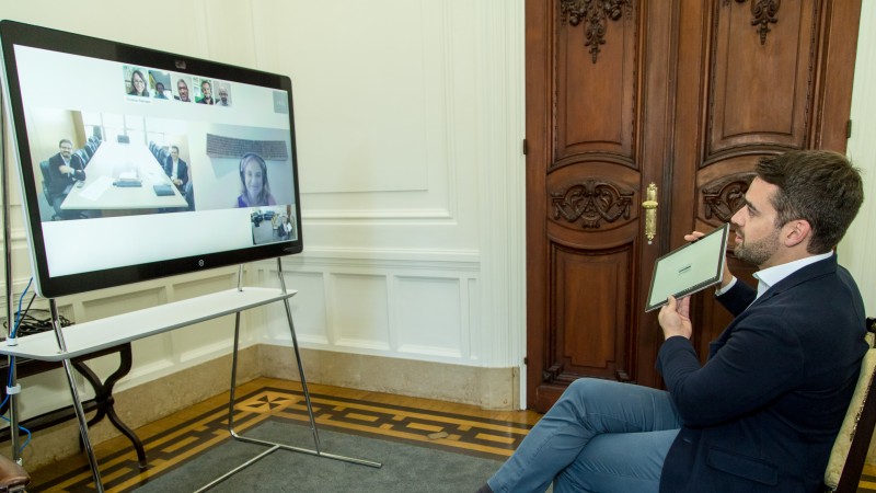Por videoconferência, governador Leite e secretários definiram a parceria com a direção da SAP – Foto: Gustavo Mansur / Palácio Piratini