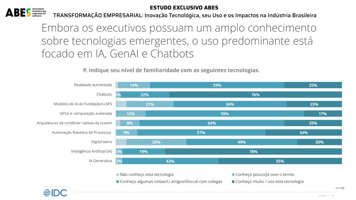 A Associação Brasileira das Empresas de Software (ABES), uma das principais entidades representativas do setor de tecnologia da informação e software no Brasil, divulga os resultados do estudo “Transformação Empresarial: Inovação Tecnológica, seu Uso e os Impactos na Indústria Brasileira”, realizado com exclusividade e em parceria com a International Data Corporation (IDC). O levantamento traça um panorama atual e estratégico sobre como as empresas brasileiras estão utilizando tecnologias emergentes, com foco especial na inteligência artificial (IA) e suas aplicações nos setores de agronegócio, finanças, saúde e educação.