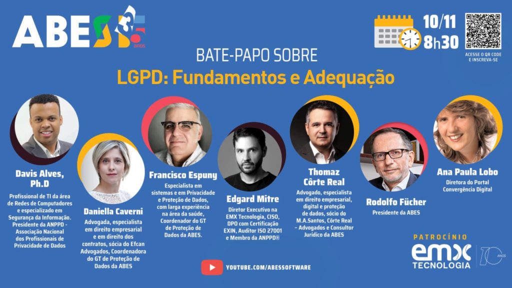 A ABES reunirá experientes profissionais para conversar sobre o tema no dia 10/11, às 8h30, considerando as mais recentes diretrizes da ANPD – Autoridade Nacional de Proteção de Dados. Eles vão compartilhar sua experiência e conhecimento sobre implementação e adequação em empresas de todos os portes e setores. O evento LGPD: Fundamentos e Adequação tem patrocínio da EMX Tecnologia. Inscreva-se gratuitamente!