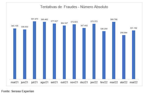 No mês de maio 331.162 brasileiros foram vítimas das tentativas de fraude de acordo com o Indicador Serasa Experian que mapeia estas ações. O número representa que a cada 8 segundos alguém tentava aplicar um golpe no país. O principal alvo dos fraudadores foi o segmento de Bancos e Cartões com 53,3% do total de todas as investidas. O estudo analisa números de utilização indevida de identidade, como abertura de contas e até mesmo emissão de cartões. Em segunda posição, está o segmento das Financeiras, com 17,1%, seguido por Serviços, 16,1%, Varejo, 10,6%, e Telefonia, que representa apenas 3% do total das tentativas. Veja os números totais no gráfico abaixo.