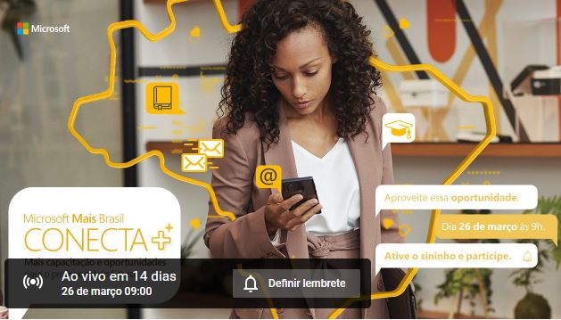 Com o objetivo de apoiar os brasileiros na capacitação e recapacitação profissional e conexão com oportunidades no mercado de trabalho na área de tecnologia, a Microsoft lança no próximo dia 26 de março, às 9 horas, durante evento online que será transmitido pelo Youtube https://aka.ms/MSConectaMais, o programa Microsoft Conecta+, iniciativa que terá duas frentes de atuação: Capacitação e Conexão. Serão oferecidas três trilhas de capacitação gratuitas com mais de 20 cursos com certificação em tecnologia. Ao todo serão mais de 300 horas de treinamento on demand, mais de 180 horas em treinamentos “ao vivo” com professores em português, com capacidade para atender mais de 80 mil pessoas de abril a junho de 2022. Além disso, aqueles que participarem do programa podem se cadastrar no Modern Talent Hub, um portal onde as pessoas que estão em busca de emprego ficarão visíveis para as empresas que fazem parte do ecossistema da Microsoft e tem vagas disponíveis. Para participar, basta ter 16 anos e interesse pela área tecnologia.
