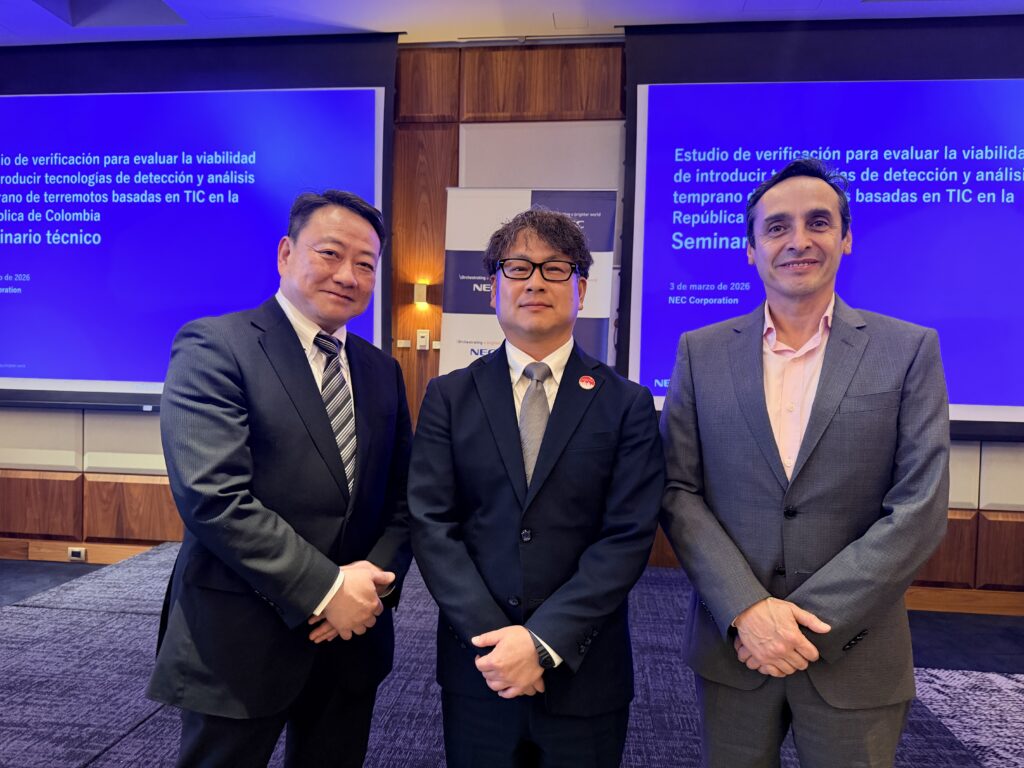 NEC concluiu um estudo voltado à avaliação da viabilidade de implementação do Sistema de Alerta Precoce de Terremotos (Earthquake Early Warning System – EEWS) desenvolvido pela empresa na Colômbia. O projeto foi realizado entre setembro de 2025 e março de 2026, no âmbito de uma chamada pública do Ministério de Assuntos Internos e Comunicações do Japão.