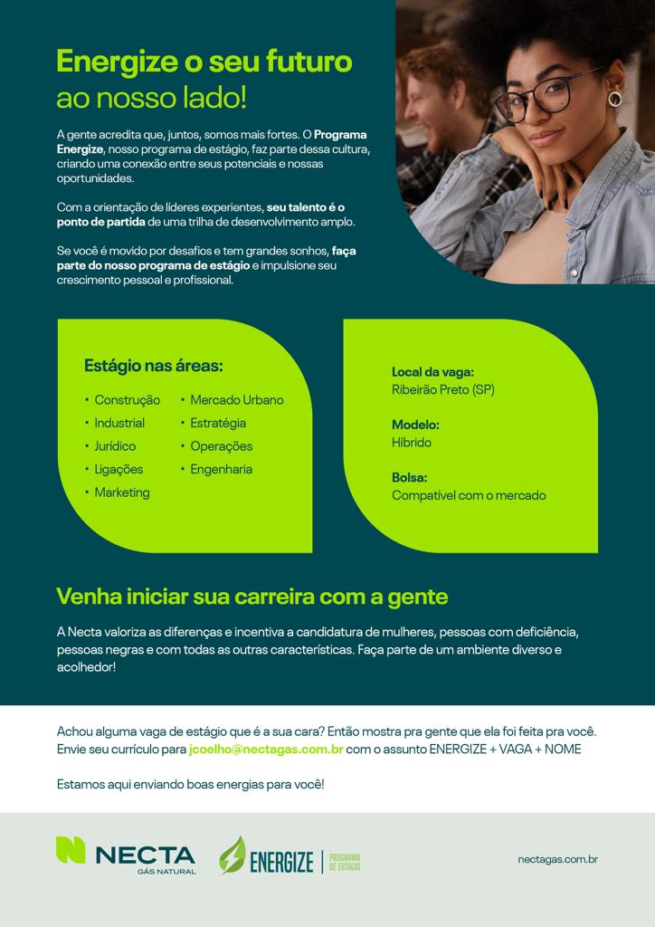 A Necta Gás Natural está com vagas de estágio em seu Programa Energize nas áreas de Construção, Industrial, Jurídico, Ligações, Marketing, Mercado Urbano, Estratégia, Operações e Engenharia na cidade de Ribeirão Preto, em modelo de trabalho híbrido e com bolsa compatível com o mercado.