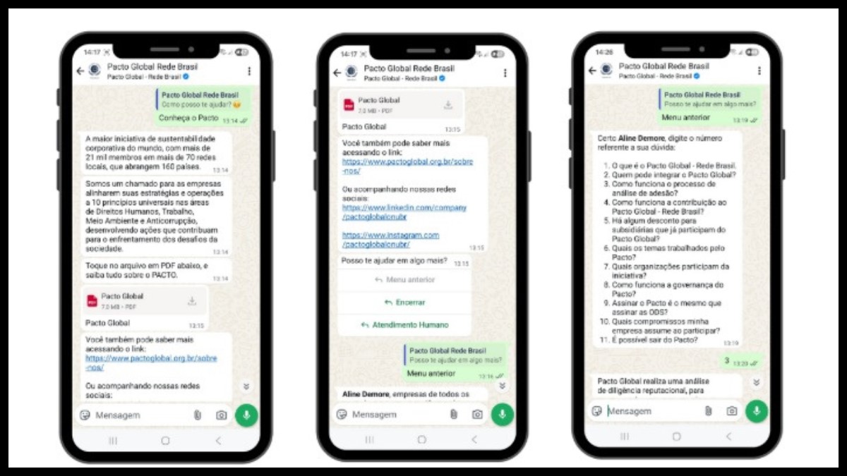 Entre as funcionalidades já disponíveis no contato inteligente estão: histórico e materiais de apoio sobre o Pacto Global, respostas para perguntas frequentes, coleta de dados, ponto de contato para adesão de novas empresas e triagem automatizada para direcionamento ao time responsável.