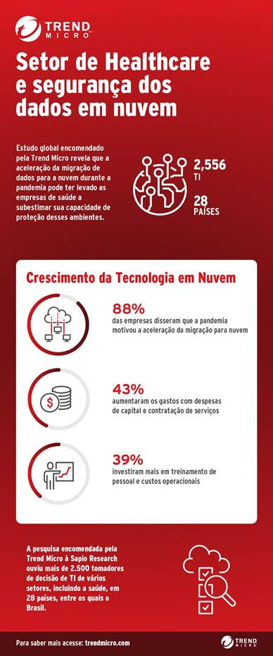 A Trend Micro, líder mundial em soluções de cibersegurança, descobriu que as empresas de saúde (Health Care Organizations) aceleraram os gastos com a migração para nuvem, mas muitas podem ter superestimado sua capacidade de proteger esses ambientes. Isso é o que revela uma pesquisa encomendada pela Trend Micro à Sapio Research, e realizada com mais de 2.500 tomadores de decisão de TI de vários setores, incluindo a saúde, em 28 países. Entre as empresas ouvidas, 88% aceleraram a adoção da tecnologia em nuvem por causa da pandemia. O trabalho remoto, a redução de custos e maior agilidade em TI foram as três principais razões apontadas para a mudança da infraestrutura baseada em nuvem.