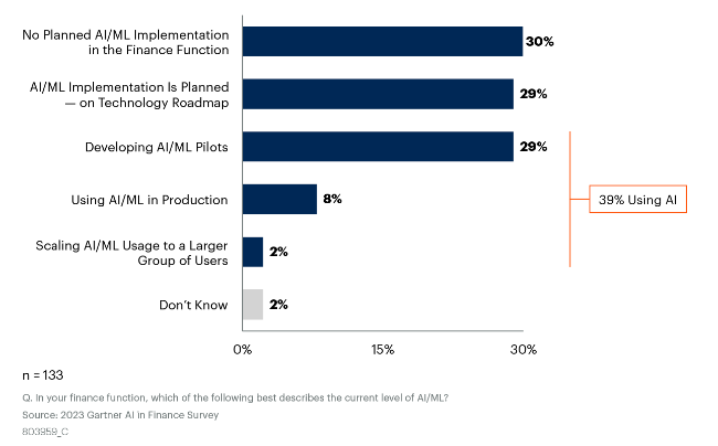 Sessenta e oito por cento das organizações financeiras estão usando Inteligência Artificial (IA) ou planejam usar essa tecnologia, de acordo com pesquisa realizada pelo Gartner com 133 líderes financeiros globais. Desse total, o Gartner, líder mundial em pesquisa e aconselhamento para empresas, constatou que 39% dos entrevistados já estão usando IA e Machine Learning (Aprendizado de Máquina), e outros 29% indicam que o uso dessas tecnologias está planejado.
