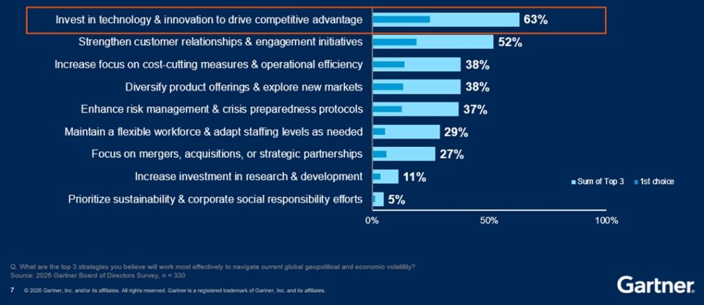 Embora a tecnologia seja vista pelos membros dos board como uma área de risco emergente para o valor para os acionistas — incluindo o potencial disruptivo da IA —, ela também é vista como uma alavanca essencial para navegar pela volatilidade que se aproxima.