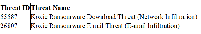A Picus Threat Library inclui as seguintes ameaças para o ransomware Koxic: