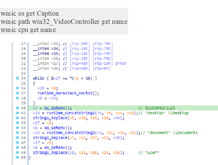 O Aurora usa principalmente a biblioteca lxn/win para obter informações relacionadas ao sistema, que dependem do WMIC. Os seguintes comandos wmic são executados no host infectado: