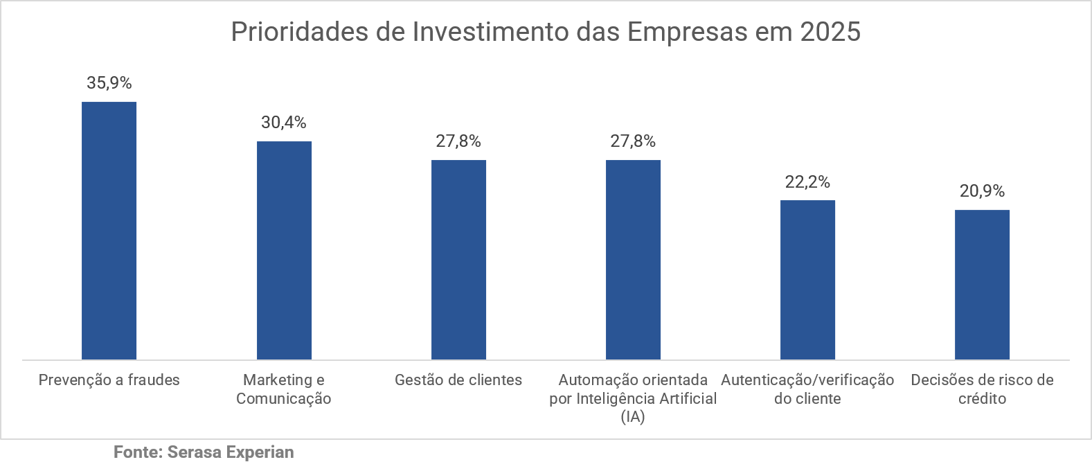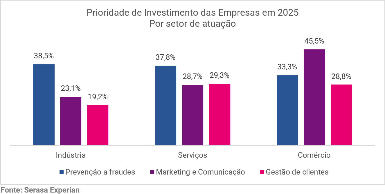 Quase 40% das empresas brasileiras estão mais inclinadas a investir em ferramentas de prevenção à fraude do que em marketing (30,4%) e gestão de clientes (27,8%), segundo o “Relatório de Identidade e Fraude 2025 da Serasa Experian, primeira e maior datatech do Brasil. A pesquisa ouviu representantes de empresas brasileiras entre abril e maio deste ano.