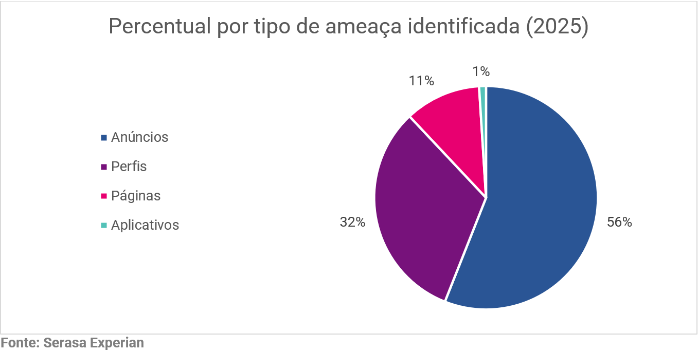 A Serasa Experian também observa que a maior parte das ocorrências detectadas em 2025 está associada a anúncios fraudulentos (56%), seguidos por perfis falsos (32%) — que, em muitos casos, funcionam como “vitrines” para direcionar o consumidor a páginas, formulários ou aplicativos maliciosos. Abaixo, confira um gráfico que detalha o percentual da natureza das ameaças: