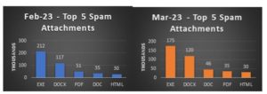 Os ataques por e-mail também continuam sendo um vetor importante para os criminosos cibernéticos. Em fevereiro e março, os 5 principais tipos de anexos de spam detectados pelas ferramentas Trend Micro foram semelhantes, mas com algumas mudanças na classificação. Nos dois meses, os anexos do tipo EXE foram os mais utilizados, com pouco mais de 212 mil e 174 mil registros, respectivamente. O segundo anexo mais comum foi o DOCX, com cerca de 117 mil contagens, em fevereiro e 120 mil, em março. Os arquivos DOC e PDF trocaram de posição entre os dois meses, revezando-se entre o terceiro e quarto lugar, e os HTML completaram o Top 5.